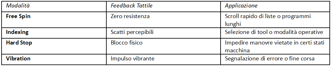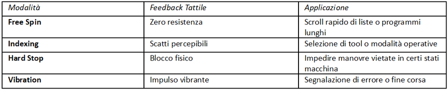 Vi è poi uno degli aspetti probabilmente più sottovalutati: interagire con l'operatore attraverso una comunicazione tattile. Ad esempio, se un macchinario raggiunge un fine corsa oppure una condizione critica, è possibile impostare una vibrazione o un aumento improvviso della coppia resistente. In questo modo, l’operatore riceverà istantaneamente un'informazione inequivocabile attraverso il tatto, senza dover guardare popup di allarme sul monitor. Nei contesti delle lavorazioni di alta precisione, questo feedback aptico istantaneo elimina i tempi di reazione necessari alla lettura di un allarme visivo, facendo la differenza tra un normale ciclo di lavoro e un fermo macchina, per una sicurezza attiva e un feedback ad “occhi liberi”.